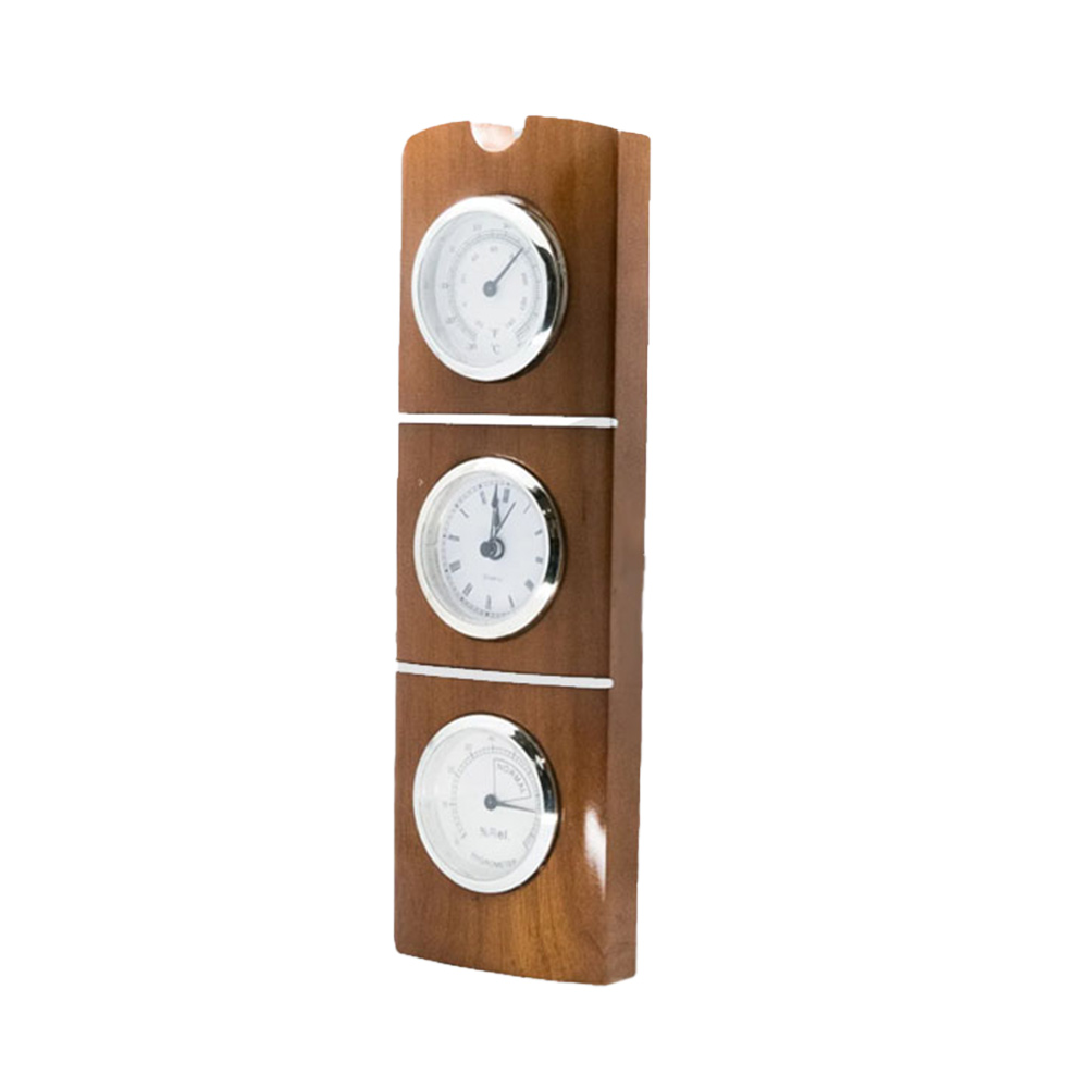 Classic wooden design with clock, thermometer, and hygrometer functions