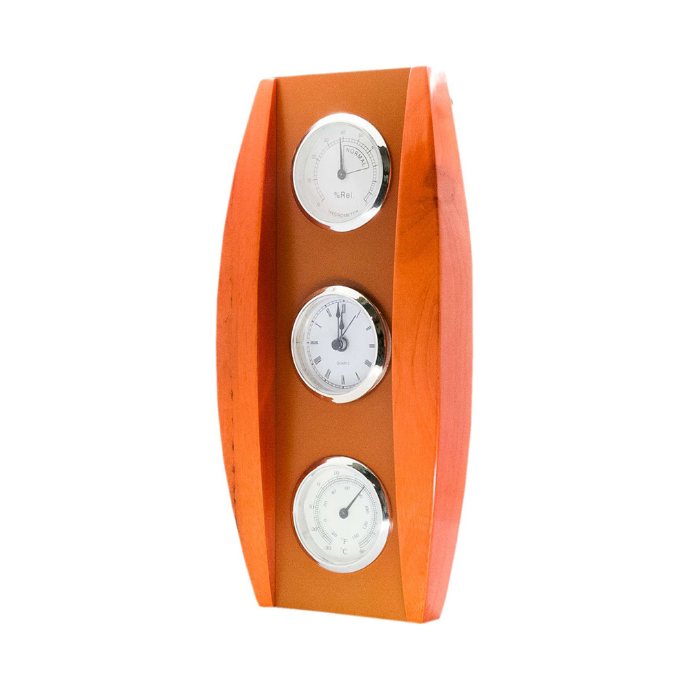Introducing the Viaduct Wooden Clock, Thermometer, and Hygrometer, a stylish and functional piece that elevates any space with its classic charm and multi-purpose design. This elegant wooden unit seamlessly combines a clock, thermometer, and hygrometer, offering you a comprehensive solution to monitor time, temperature, and humidity in one place. What makes this piece unique is its ability to convert into three separate clocks, providing versatility and convenience for any home or office setting. Crafted with quality materials and attention to detail, the Viaduct is the perfect corporate gift or an impressive addition to any workspace, blending practicality with sophistication.